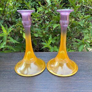 Pair of Vintage Satin Pressed Glass Candle Holders with Amber Purple Gradient