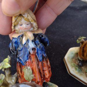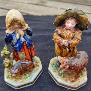 Pair of Volkstedt peasant girl/boy and their dogs figures, Germany c 1900- EUC