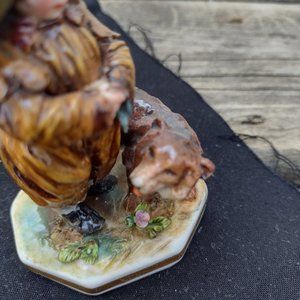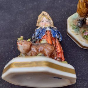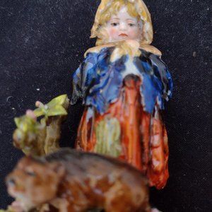 Very detailed and colorful turn of the 20th century Volkstedt pair of peasant figures, a girl and boy, dressed in raggedy clothing with their pets. Designer is Gustav Oppel. No damage found, these have been kept very well- the details to the dogs' and childrens' faces and flowers are amazing. Price is for both.