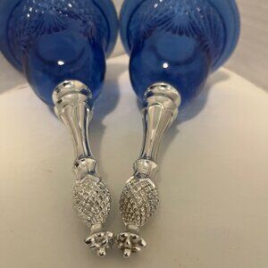 From the 1970’s. Colors: blue and silver. Material etched glass with metal screw top. Shaped like bells. Empty does not contain perfume. Condition: good.