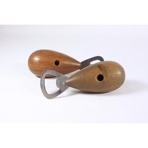 A pair of minimalist wooden dove or pigeon bottle openers, the steel tails being the openers. The heads can rotate fully without coming loose. There is a hole in each of them, where once would have sat a corkscrew, but those are long gone. The brown headed bird sits up well, the opener is marked "stainless steel", the red-headed bird prone to sitting askew and with rust to the unmarked opener.