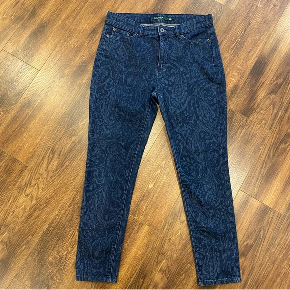 Super fun skinny ankle jeans by Lauren Ralph Lauren in a size 10. Pretty paisley print in a high rise stretch cotton denim.
