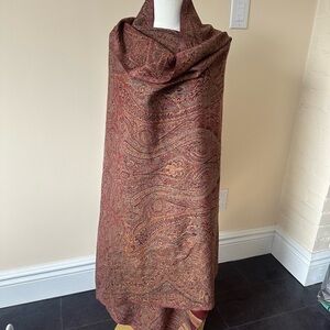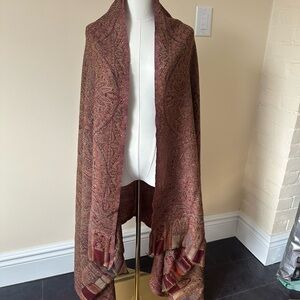 Elegant paisley shawl. Likely wool although there are no care tags. Slight fringed detail on short side. 42”x84”. Beautiful colour and detail. Lightweight but warm.