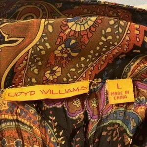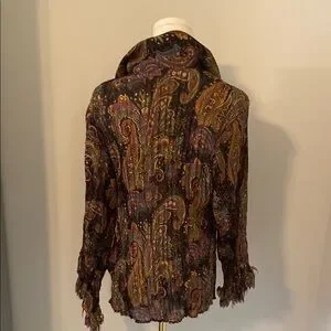 Elevate your wardrobe with this elegant paisley ruffle blouse. Featuring a vibrant multicolor design, this top is perfect for any occasion. Pair it with your favorite jeans or skirt for a chic look. Size large. From a smoke free home.
