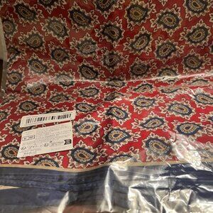 Size 28” X 28”. Material 100% polyester. Colors: red, navy, brown, black, white. Description: paisley printed on a red background with navy border. Made in China. New in package.