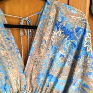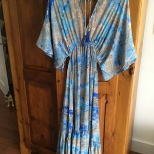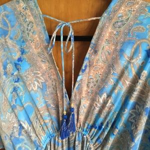 I will look tonight and let you know what the waist size is. It is a caftan style so there is really no accurate way to measure the bust. I would women’s size 8 to 12 would be the best sizes to wear this one size fits all dress.