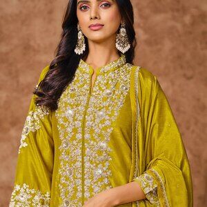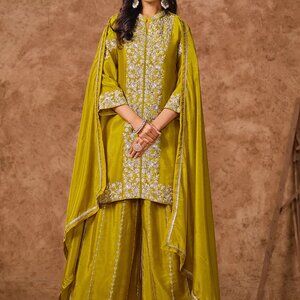 Celebrate in style with this breathtaking Chinnon Silk Palazzo Suit, designed especially for Sangeet and festive occasions. Crafted from premium Chinnon silk, this suit features intricate zari thread embroidery and shimmering sequin accents-bringing together regal tradition and effortless sophistication.