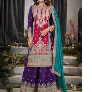 Fabric (Top): Premium Chinnon with Handmade Mirror Work Embroidery Color Options: Teal Multicolor | Orange Multicolor | Pink Multicolor Dupatta: Premium Chinnon with Embroidery Borders Style: Pakistani Palazzo Multicolor Bottom: Premium Chinnon Palazzo with Front & Back Embroidery Work: Dabka Dori, Sequence, and Handmade Mirror Work Embroidery Maximum Top Length: 40 Inches Palazzo Length: 43 Inches Size Range: M (38) | L (40) | XL (42) | XXL (44) | 3XL (46) Occasion: Weddings, Festive Events, Traditional Celebrations Style Tip: Pair with traditional jewelry for an elegant, regal look.