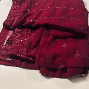 Worn one time. The colour is burgundy. Paid $150 for this. Three-piece.