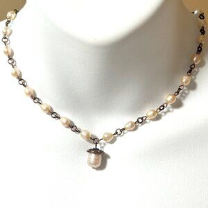 Pale Pink Freshwater Pearl Short Necklace with Cute Pendant, Copper Links