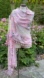 A stunning pale pink long shawl made up of panels of hand stitched Kantha and eyelet lace, with bands of sheer tulle in between.