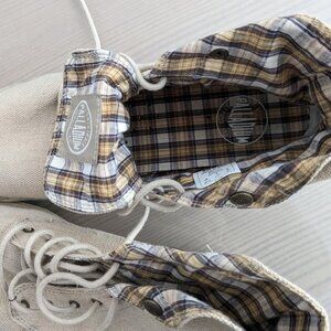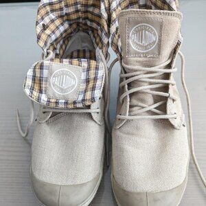 Palladium brand boots, Spring/Summer in beige “jute” canvas with yellow, beige and brown checkered internal lining. Size 9 US / 42 EUR. In perfect condition.