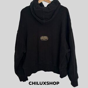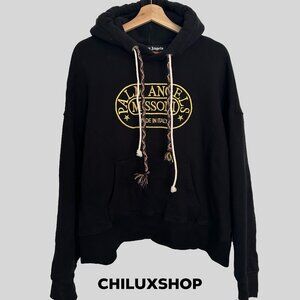 This black slouchy cotton hoodie is designed as part of the Palm Angels x Missoni collaboration. It is punctuated with a yellow Heritage logo print at the chest, which is a handmade reworked version of a 60's Missoni graphic. Another key feature to this piece is the multicolour braided drawstrings, which reflect the brand's Melting Logo motif.
