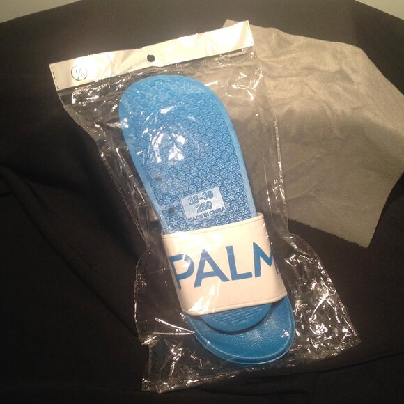 Blue sandals with the image of Palm Bay beverages, size 7-8. New and still in their packaging.