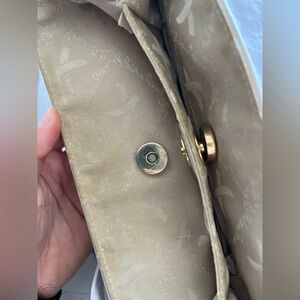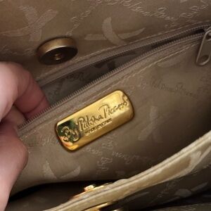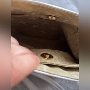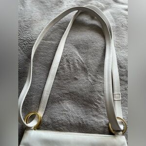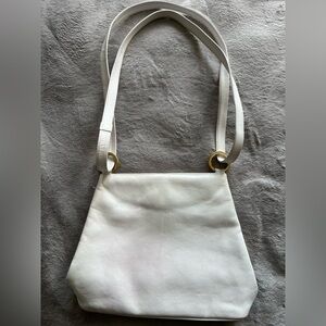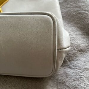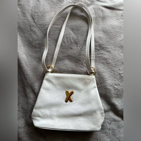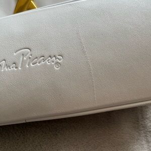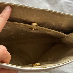 Paloma Picasso Gold Hardware and white leather exterior. Interior divider with slots and pockets.