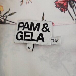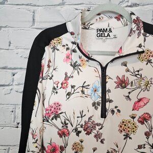 This dress from Pam & Gela is in a floral pattern with black striping at sleeves and hem. It has a stretch fit and a zip front. It is in good used condition.