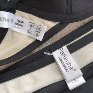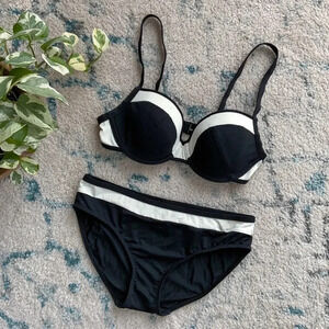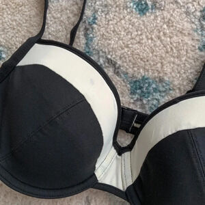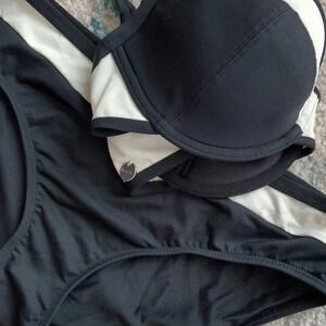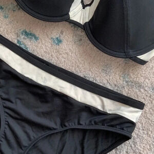 Panache 2 piece swimsuit - black/creamy white trim - cute for the beach or pool - size 34D top, bottoms Sm - pre-used condition - some staining on trim but otherwise lightly worn.