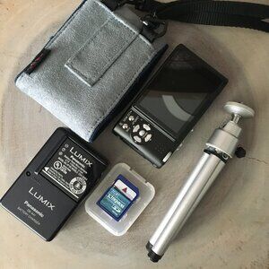 Memory card is not included. Very good preowned condition Panasonic LUMIX DMC FX10 6.0MP compact camera In black. This camera comes with a charging cable and one battery, battery charger, wrist strap and carrying case and more or less all the packaging/CD. I might be able to find the manual. The Tamrac carrying case is a very nice grey-blue and made of leather.