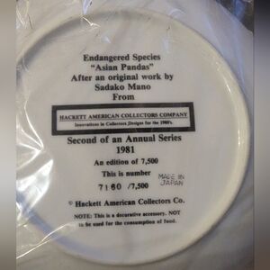 This is a beautiful 'Endangered Specie's' collectible plate featuring adorable "Asian Pandas". The mama Panda is watching her playful babies. This is after the original work by Sadako Mano from the Hackett American Collectors Company. Excellent vintage condition with no chips or cracks. Never displayed.