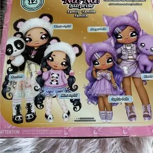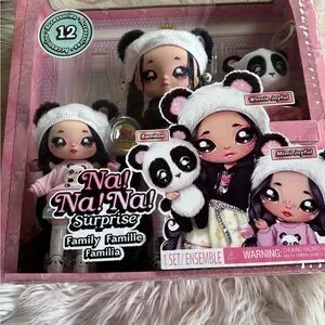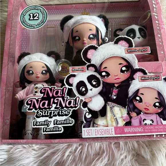 Discover the adorable Panda Family Set. Featuring cute dolls in black and white panda-themed outfits, this set is perfect for imaginative play. A delightful addition to any child's toy collection.