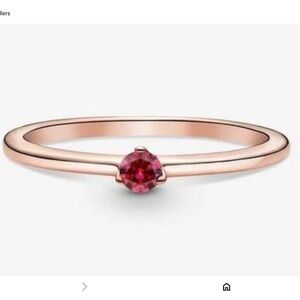 Pandora solitaire ring with deep pink ruby - like crystal. There is a little heart on the inner side of the band, right behind the stone. 14 karat rose gold unique metal alloy. Stamped ALE MET 54 which is size 7. This metal alloy contains real gold, real silver and some other additions, including copper. In excellent condition. Comes in a new Pandora jewelry box and Pandora paper shopping bag.