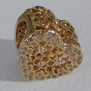 The PANDORA Shine Honeycomb Lace Charm is almost a combination of the Honeycomb Lace Pendant and the Filled With Romance Heart Charm. Embellish your look with a dazzling texture of honeycomb shapes woven like lace, covering this Pandora Shine™ heart charm in 18K gold-plated sterling silver. The clear stones enhance the lusciousness.