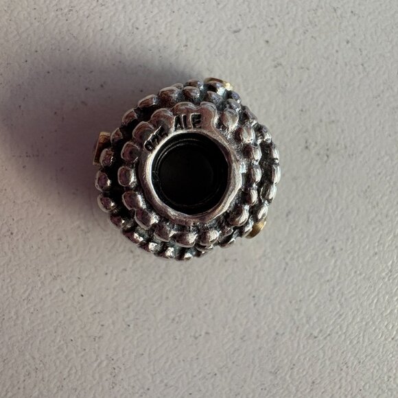 Unique Pandora two tone Entangled Beauty Charm with 3 small diamonds circled by gold.
