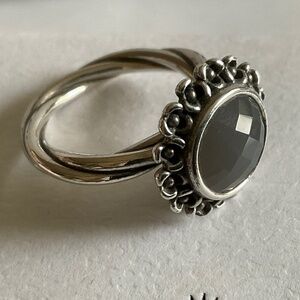 Elegant silver band with a striking black gemstone. Perfect for any occasion.