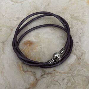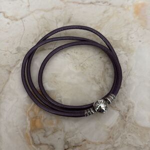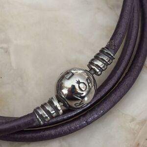 Authentic Pandora smooth leather triple wrap bracelet in excellent preowned condition. This length is no longer available, sterling round Pandora clasp. Beautiful purple colour, perfect for adding your favourite charms, layer with other Pandora bracelets…