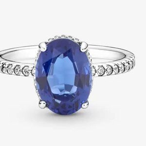 "The Sparkling Statement Halo Ring will bring glamour to any occasion. The ring features a striking blue oval man-made crystal that's been cut to show off the rich colour from the sides, accented by a pavé halo underneath. Hand-finished in sterling silver, the band is adorned with sparkling cubic zirconia stones in a nod to traditional styles. The dazzling design looks equally beautiful worn on its own or layered with other rings. A piece to stand the test of time."