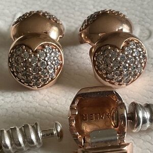 Silver bracelet with rose gold clasp, length 7.5”. Two rose gold heart clasps with clear stones on both sides.