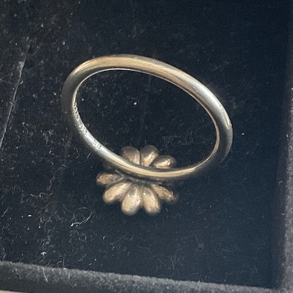 Silver with black pebbles and central 14k gold ball. Size 58 which is size 8.
