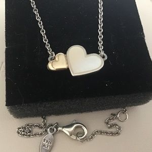 Silver and gold and mother of pearls. The bigger heart is mother of pearls and the smaller heart is gold. Chain length 17.5”.