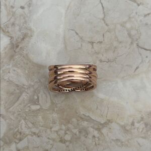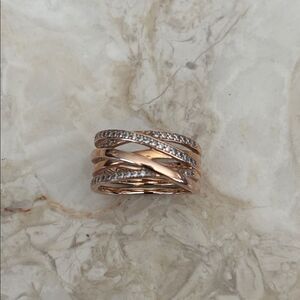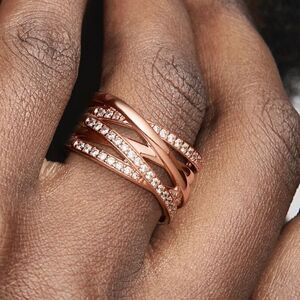 Make a sparkling statement with this gorgeous Pandora ring! Finished in 14k rose gold plating, this contemporary ring features intertwining rows of polished metal and pavé, creating a perfect balance of elegance and edge. The stones are cubic zirconia, none are missing. The plating is in excellent shape, this ring is stunning.