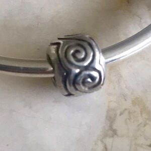 Lovely Pandora solid sterling silver bangle charm bracelet plus 6 sterling silver charms, all in good preowned condition. Please note a couple of the charms are not Pandora but they are sterling silver. Bracelet is medium size, approximately 2.75” diameter. Will come in Pandora cloth dust bag and Pandora box.