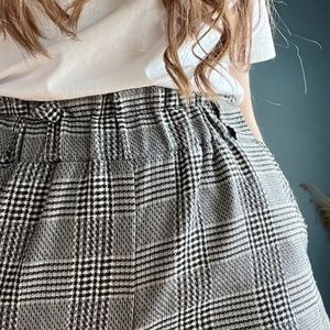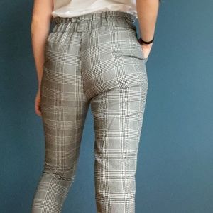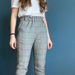 Checked dress pants with rings at the belt to wear a belt. Can be dressed up or dressed down depending on the occasion.