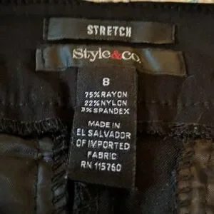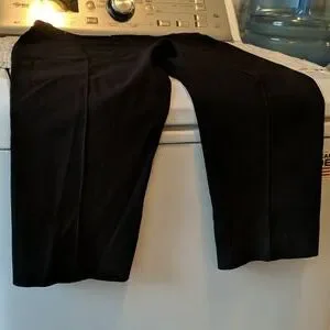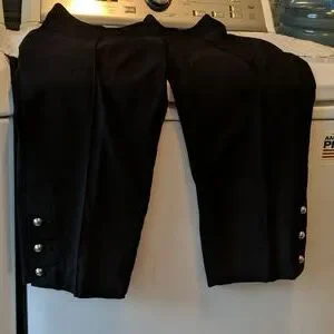 black stretch crop pants with split on bottom of legs tied with 3 buttons.