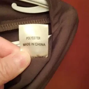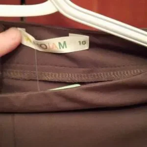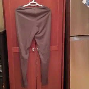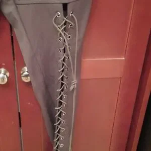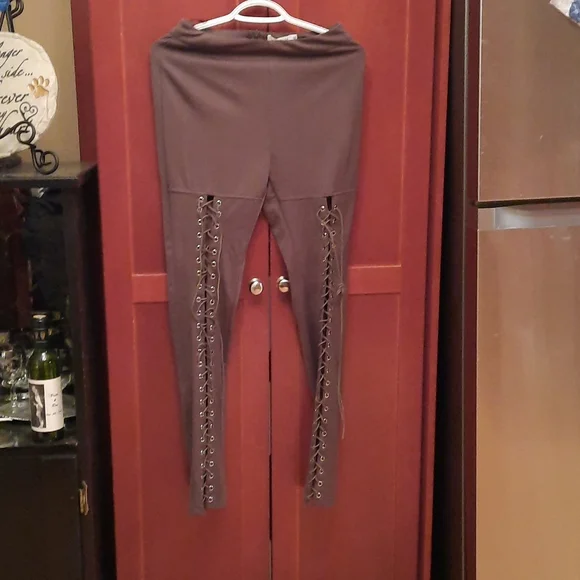 Polyester dress pants. Laced up front legs, zipper in the back. Khaki in color..
