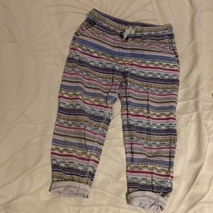 Tea Collection cotton printed joggers can be worn cuffed or uncuffed; drawstring and pockets, fabric and color shows wear: good condition. Dark pink and white striped cropped Tea Collection leggings, very minor pilling at crotch: excellent condition. Plain black leggings from Epic Threads with cute bow detail on back of ankles: excellent condition.