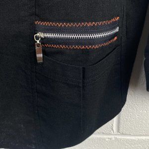 This is a lightweight cropped blazer made of linen/cotton and is in like-new condition. It features two faux zippered pockets accented by red/orange zig-zag stitching.