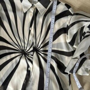 Stunning vintage Paolo Santini 100% pure silk blouse featuring a bold black and cream graphic swirl print. Lightweight and semi-sheer with a luxe drape — the kind of statement piece that instantly elevates denim or tailoring.