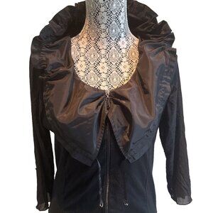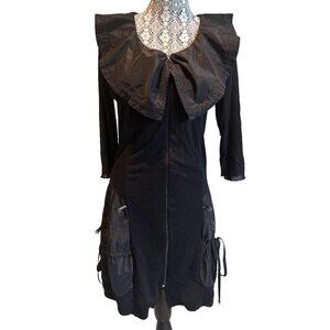 Discover a stunning piece from the renowned Italian designer PAOLO TRICOT, this dress is perfect for the modern woman seeking a unique blend of elegance and edginess. This size large dress features a striking silhouette with an impressive 37-inch length and a flattering 16-inch waist measurement when laid flat. The eye-catching ajustable collar, crafted from lightweight parachute type material, adds a dramatic flair, measuring 7 inches at its widest point and extending down the front with a functional zipper that enhances its sophisticated design.