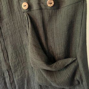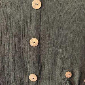 Papa black tunic. Size M. 100% rayon. Approximate length 32". Scoop neck with three brown toned buttons on the front and a drop pocket with three smaller accent buttons.