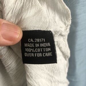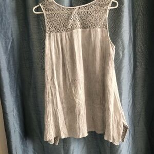 This sleeveless blouse in a soft tan hue is 100% cotton and is embellished with lace.The blouse is flair like and works well with tights, shorts, skirt, or pants. New or like new.