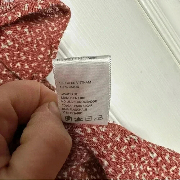 Size large Paper Crane peplum shirt. Reddish brown and white in colour. Flowy. Short, ruffled sleeves as well as ruffles at bottom. Super cute Short - not quite a crop top but not long either. 100% rayon. In excellent condition No stains or flaws Measurements (Approx - Laid Flat): Length - 18.5” Chest - 20.5” Waist - 19”