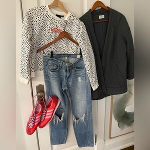 Minimalistic lightweight women’s coat/jacket in size Small. Clean boxy-fit, 2 light magnetic closures, 2 pockets, and a long silhouette for easy bum-coverage.