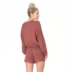 This is a crew-neck sweater with a slightly boxy silhouette, a raglan sleeve and an underarm satin panel.
