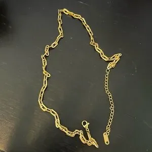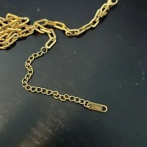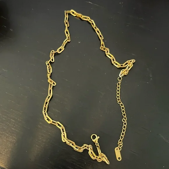 Gold plated (I believe over steel) necklace. Looks nice stacked with other daintier pieces.