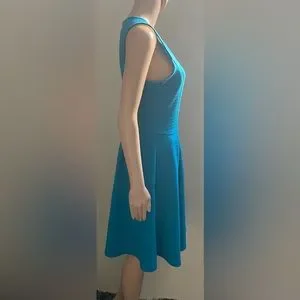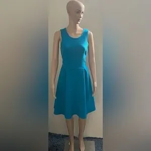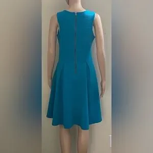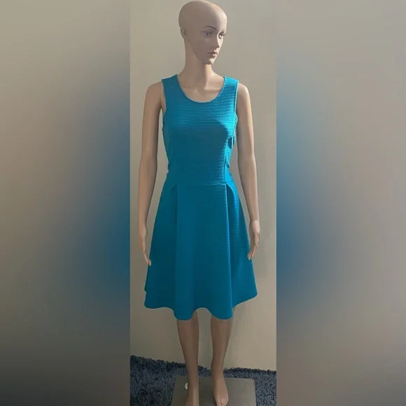 Teal Blue Sleeveless Textured Fit & Flare Dress. Wide Pleated Skirt. Back Zip 95% Polyester, 5% Spandex Size Medium 37” Length 34” Bust 30” Waist 40” Hip