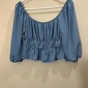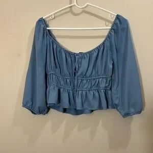 Chic blue blouse with ruffled details. Features a scoop neckline and long sleeves. Ideal for casual outings. Really light, but beautiful shirt!